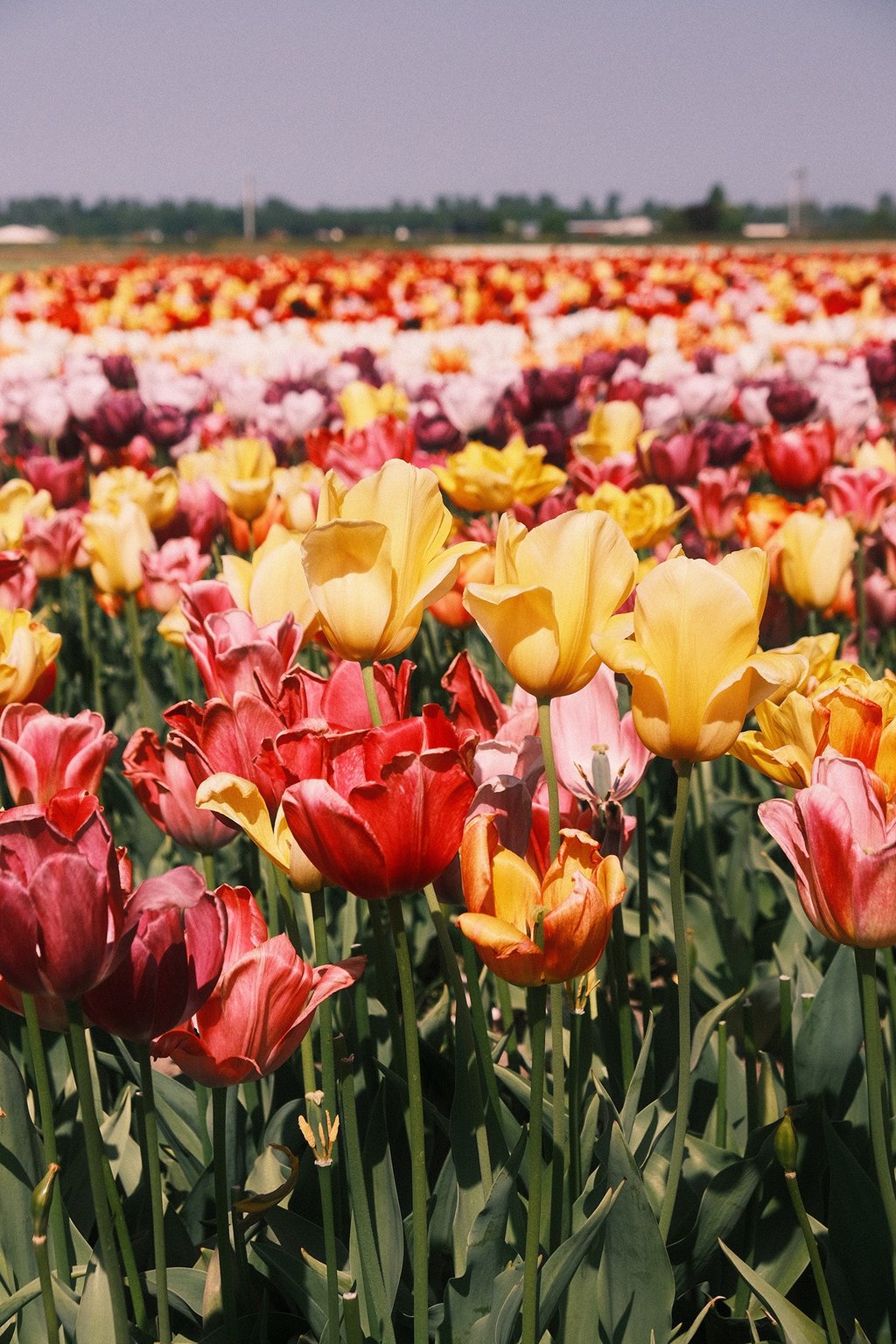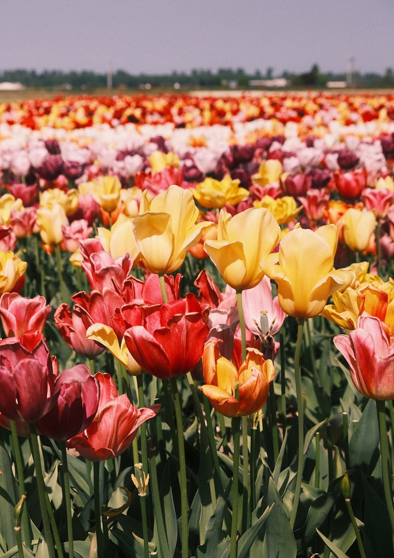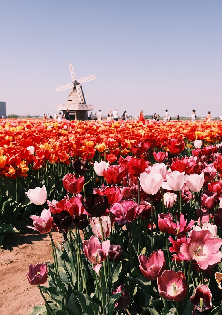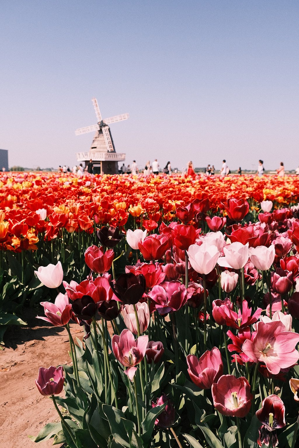 The location features a vibrant tulip field with over 400,000 blooms in various colors and varieties.